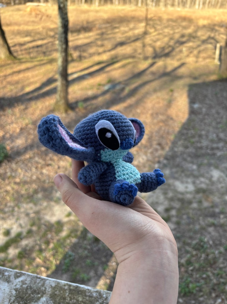 After a pretty thorough search, I wasn’t able to find any kind of pattern for the hanging toy, but I did find this adorable Stitch plushie pattern on Pinterest, so I just made it a bit smaller and ended up attaching a little swing to it. I was happy with how it turned out!