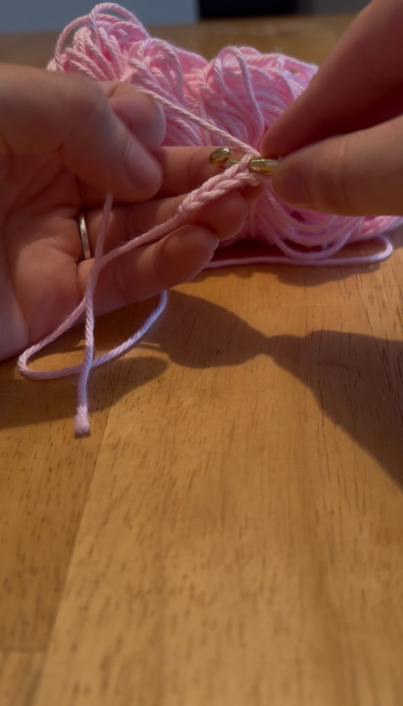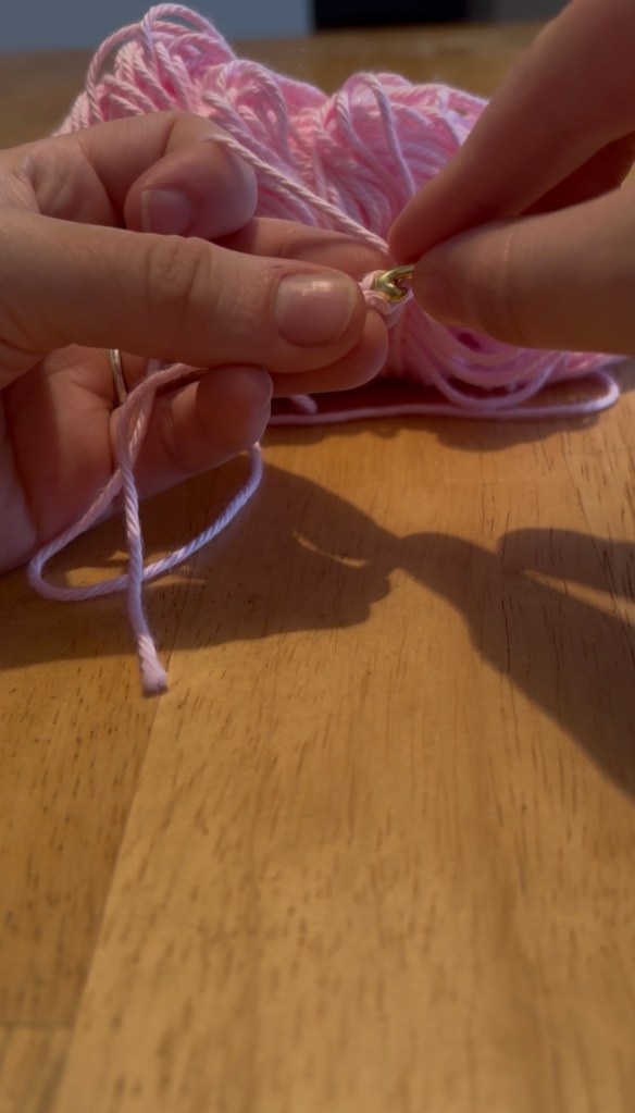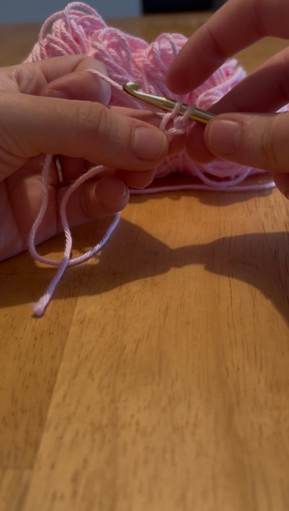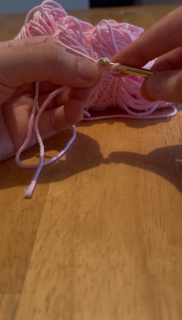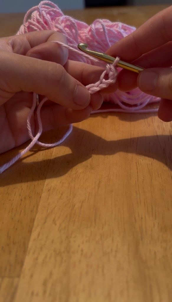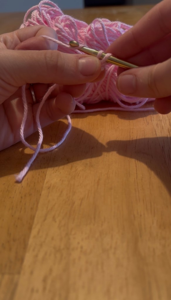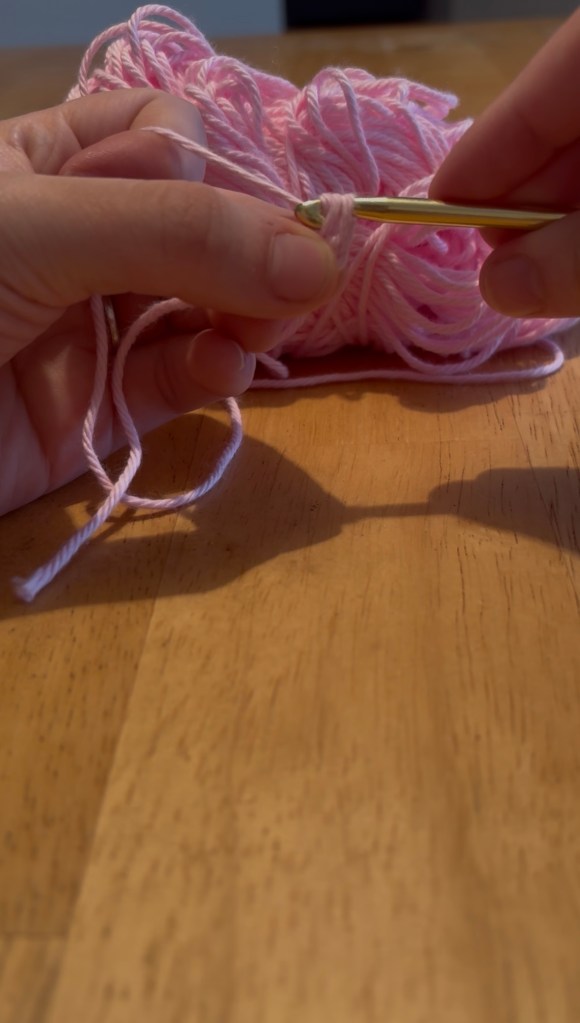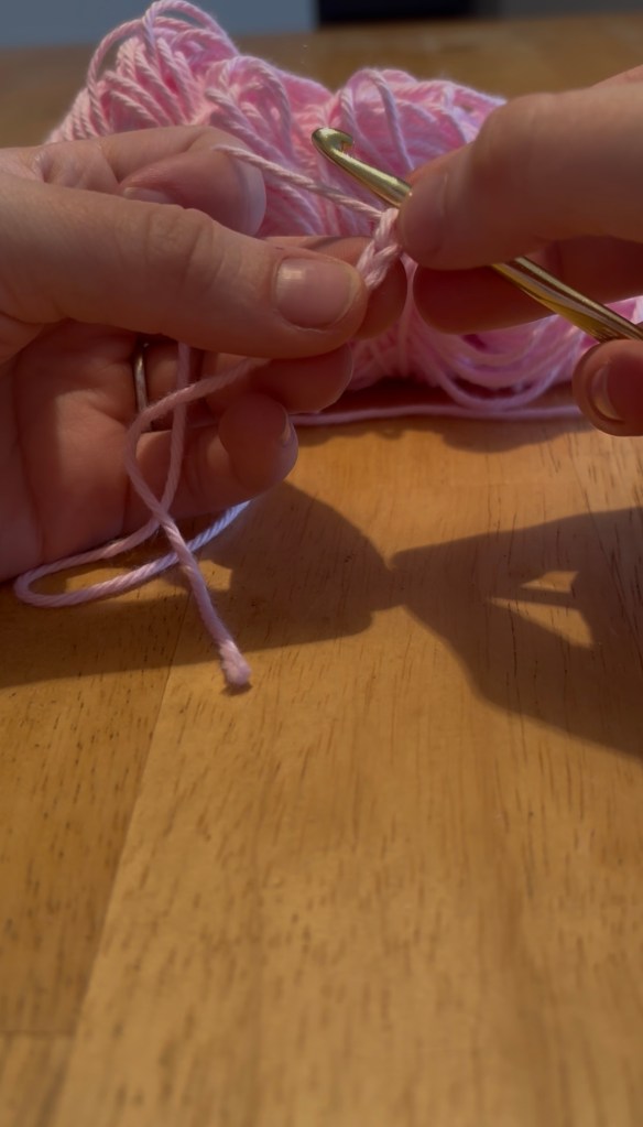 I’m using an aluminum Boye H/5mm crochet hook and I Love This Cotton light pink worsted weight cotton yarn. We’ll start by making a slip knot and 5 chain stitches.