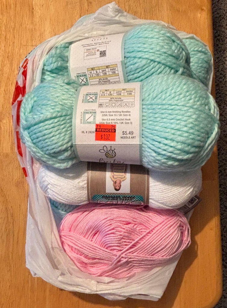 Last week I made a routine trip to Hobby Lobby to get more yarn for a project and ended up finding several skeins of this soft, chunky baby yarn on sale for $1.37 apiece. It was too good a deal to pass up so of course I bought it. The catch? It’s blue, and I’m having a girl. What could I possibly make for a baby girl with blue yarn?
